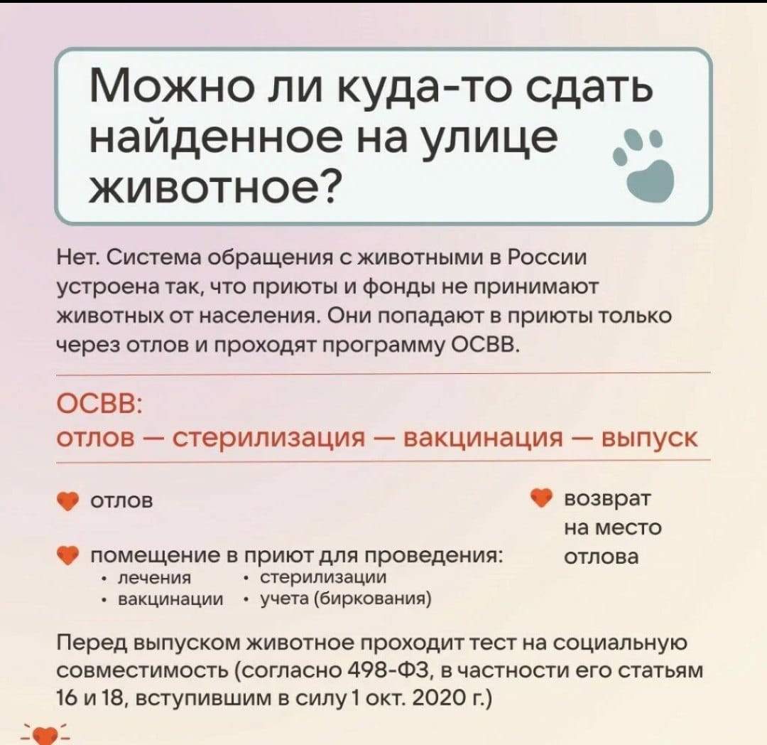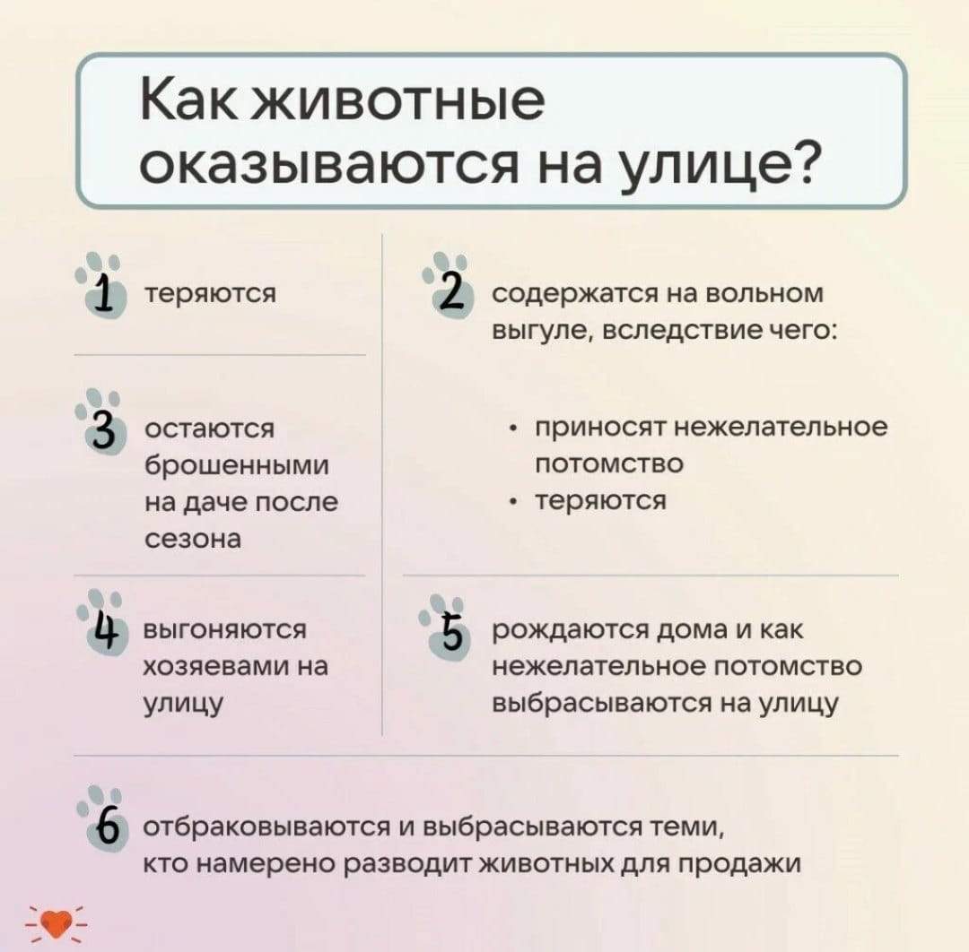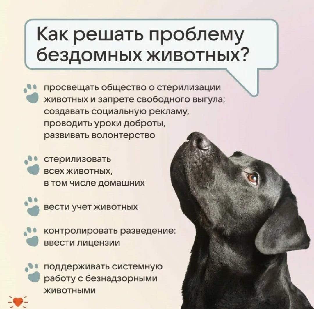 Предлагаем всем вместе изучить карточки, в которых рассказывается как можно решить проблему безнадзорных животных в России, откуда берутся бездомные животные, как жить с ними мирно и можно ли им как-то помочь.