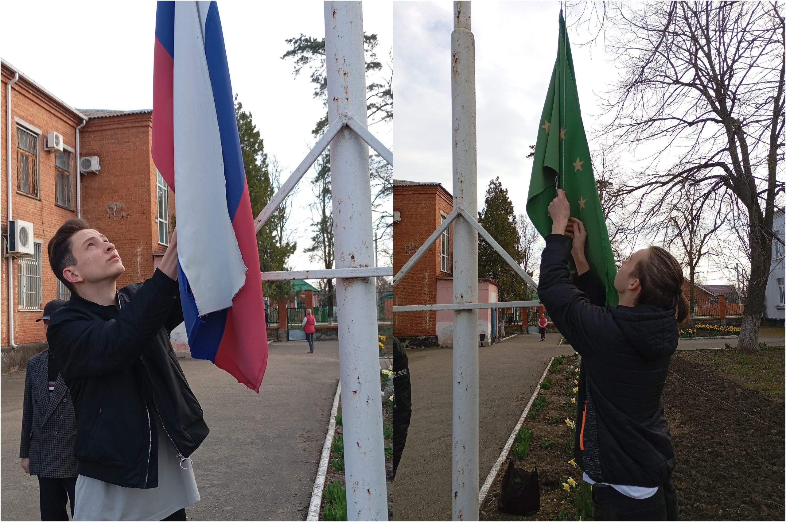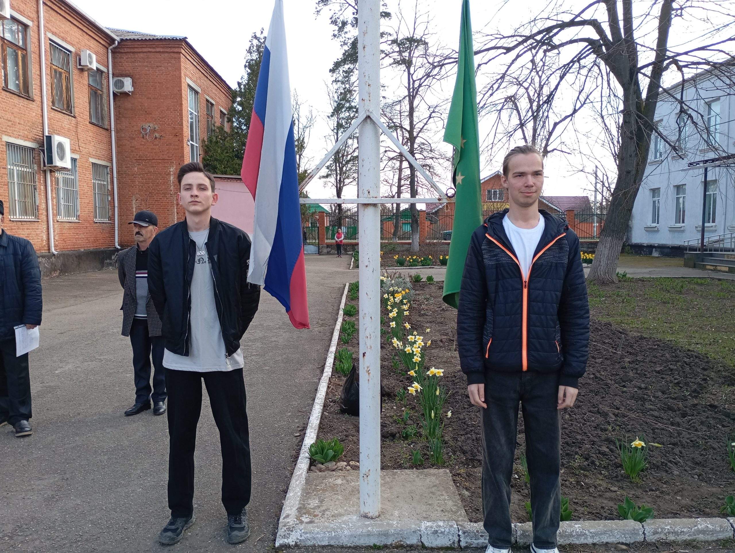 Почётное право поднять Государственные флаги России и Адыгеи предоставилось двум студентам группы 7 СВ: