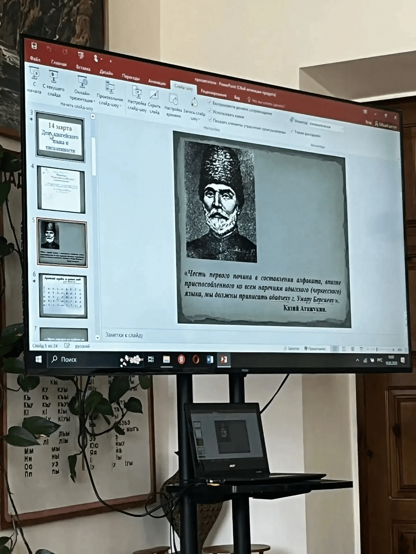 Мариет Аскарбиевна рассказала о различных методах использованных просветителями для обучения и распространения знаний среди адыгского народа. Рассказала о создании первых школ и учебников на адыгейском языке. Мариет Аскарбиевна отметила, современные вызовы, с которыми сталкивается адыгейский язык, включая глобализацию и влияние других культур.