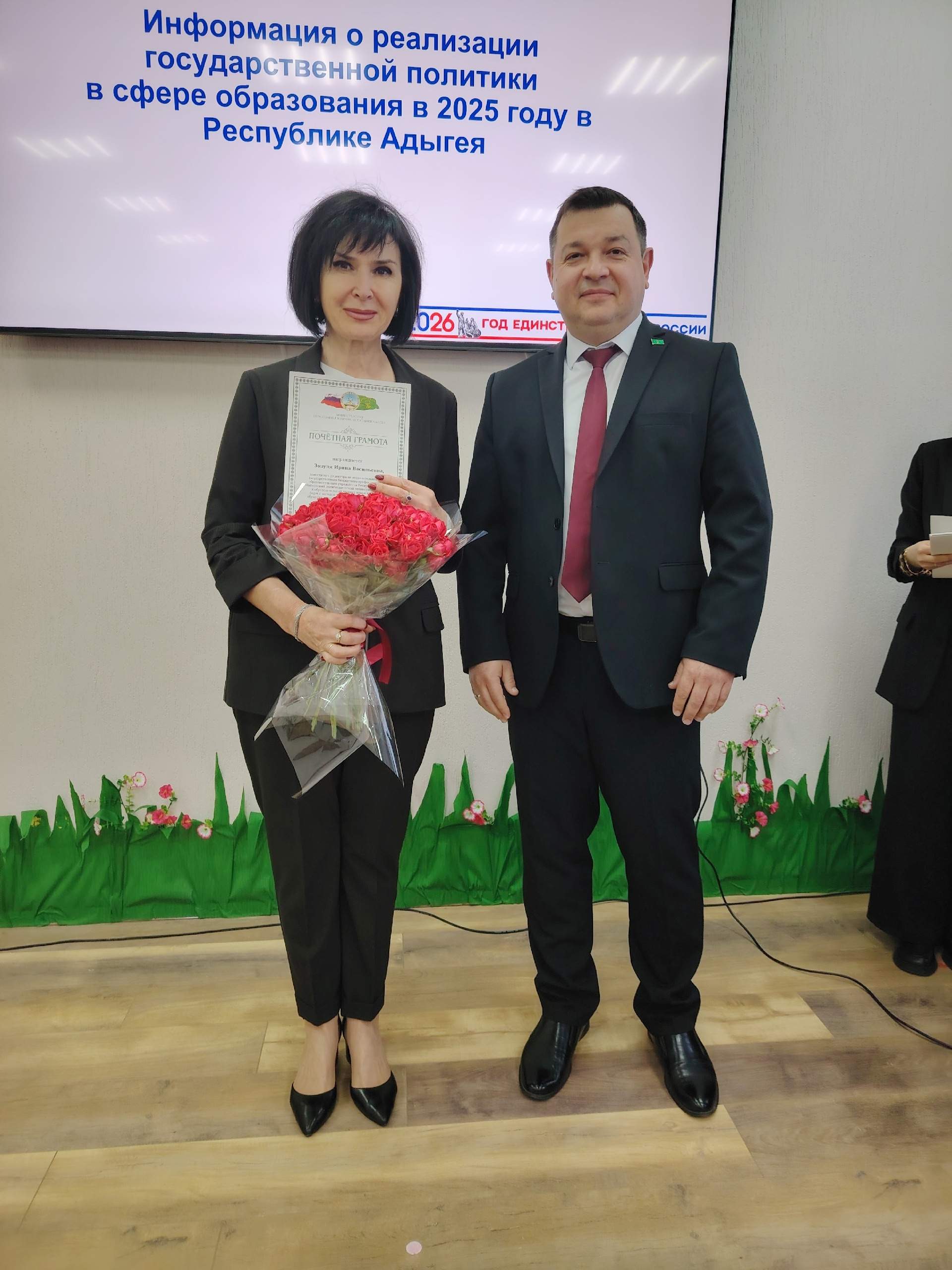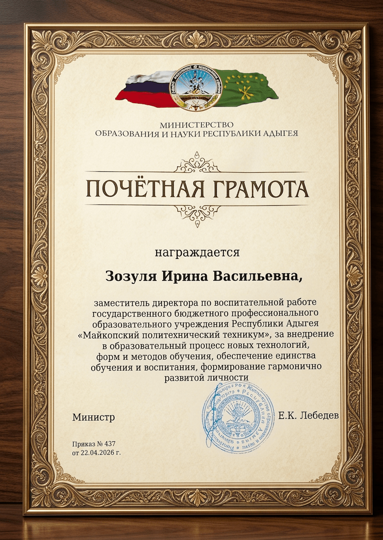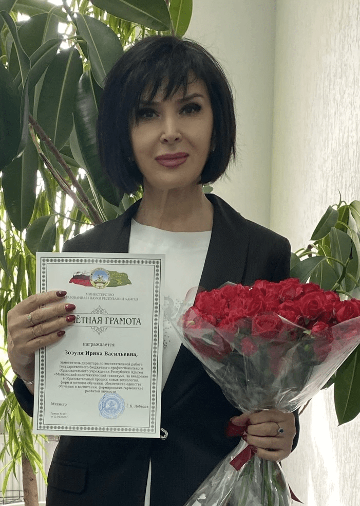 Почётной грамотой награждена Зозуля Ирина Васильевна, заместитель директора по воспитательной работе Майкопского политехнического техникума, за внедрение в образовательный процесс новых технологий, форм и методов обучения, обеспечение единства обучения и воспитания, формирование гармонично развитой личности.