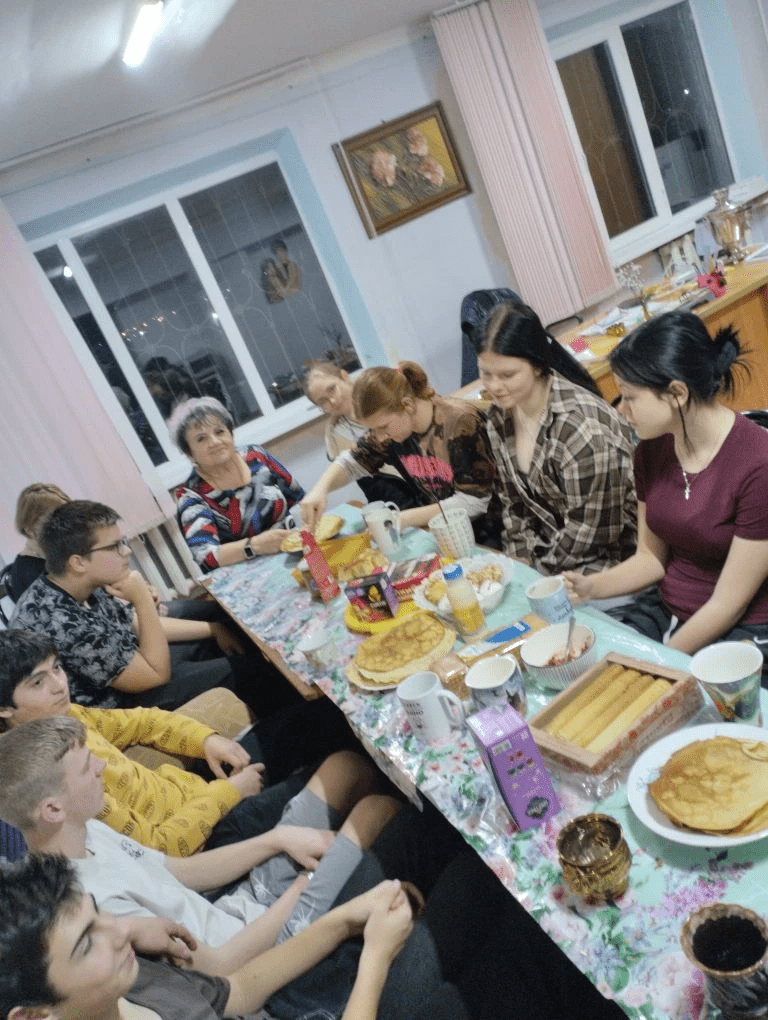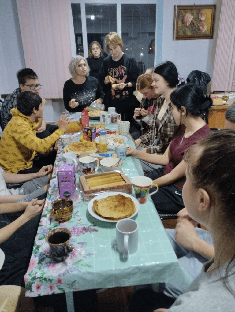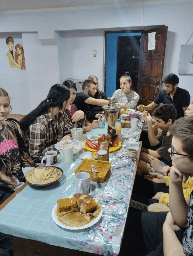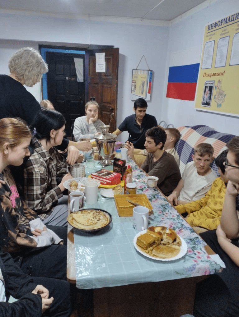 Сегодня снова пахнет блинами — и это, пожалуй, лучший запах на свете. Студенты снова собрались за большим столом, а на нём — горка румяных блинчиков, сгущёнка, варенье и, конечно, настоящий самовар с чаем.