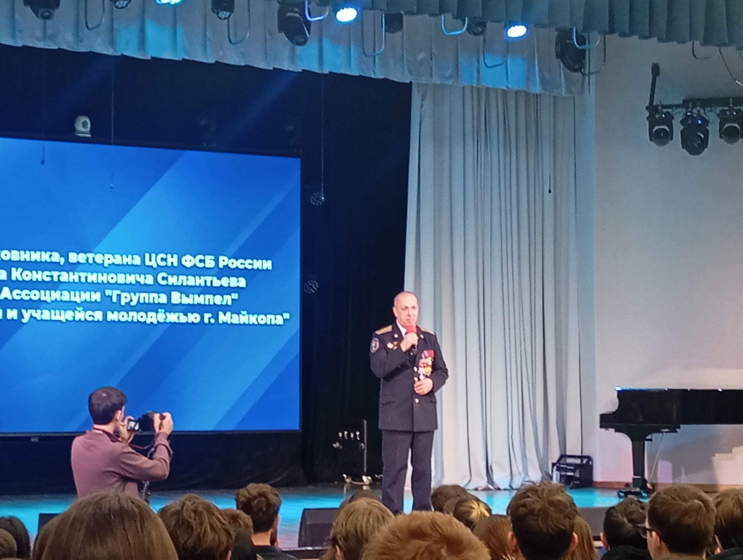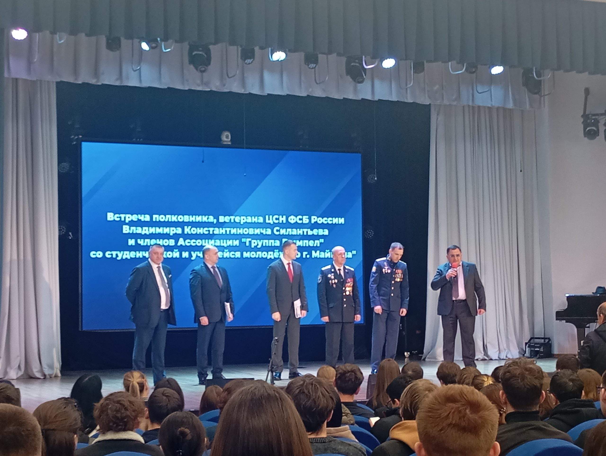 Сегодня студенты Майкопского политехнического техникума приняли участие во встрече с полковником, ветераном ЦНС ФСБ России — Владимиром Константиновичем Силантьевым и членами Ассоциации «Группы Вымпел».